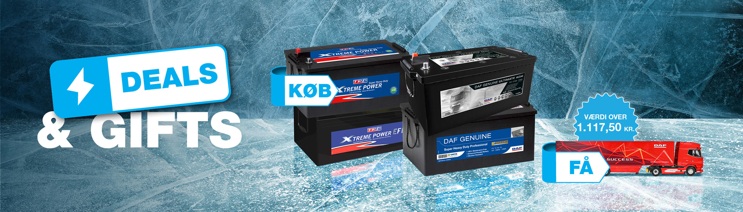 Med et køb af minimum 12 udvalgte batterier i én ordre får du en gratis DAF XG+ 1:50 miniaturelastbil til en værdi af over 1.117,50 kr, så du kan blive vinterklar. Med koldere temperaturer på vej vil et pålideligt batteri kunne holde dine lastbiler kørende.