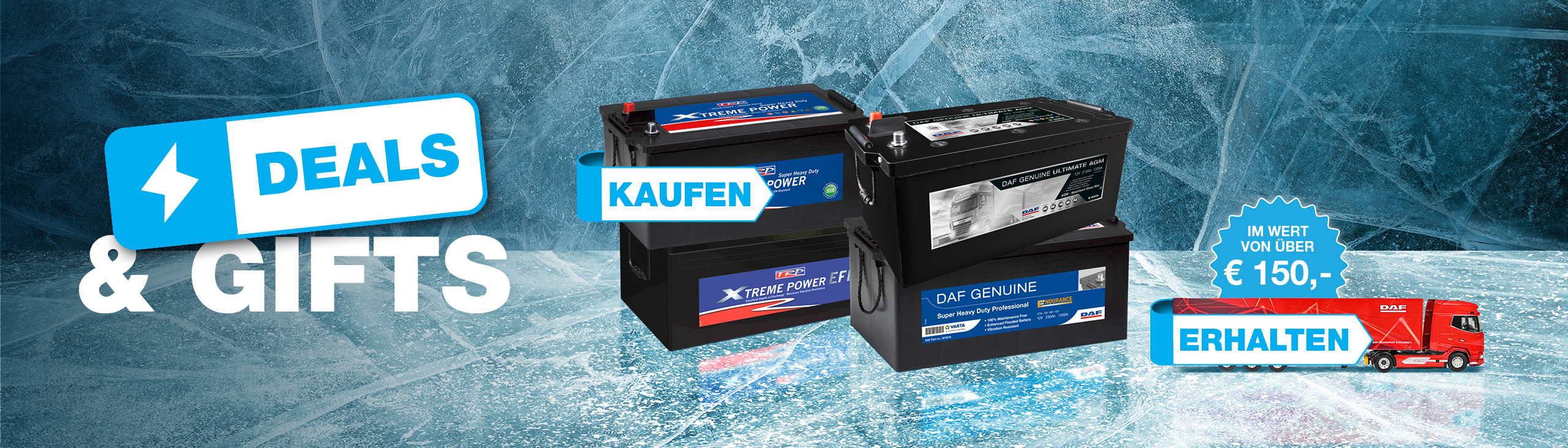 Beim Kauf von mindestens 12 ausgewählten Batterien in einer Bestellung erhalten Sie einen DAF XG+ 1:50-Miniatur-Lkw im Wert von über €150 gratis. So können Sie sich auf den Winter vorbereiten – denn bei niedrigeren Temperaturen sorgt eine zuverlässige Batterie dafür, dass Ihre Lkw ohne Probleme laufen.