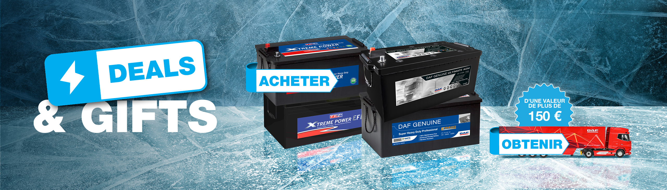 Lorsque vous achetez au moins 12 batteries en une seule commande via le Webshop DAF, vous recevez gratuitement un modèle réduit de Camion DAF XG+ au 1:50 d'une valeur supérieure à 150 €.
