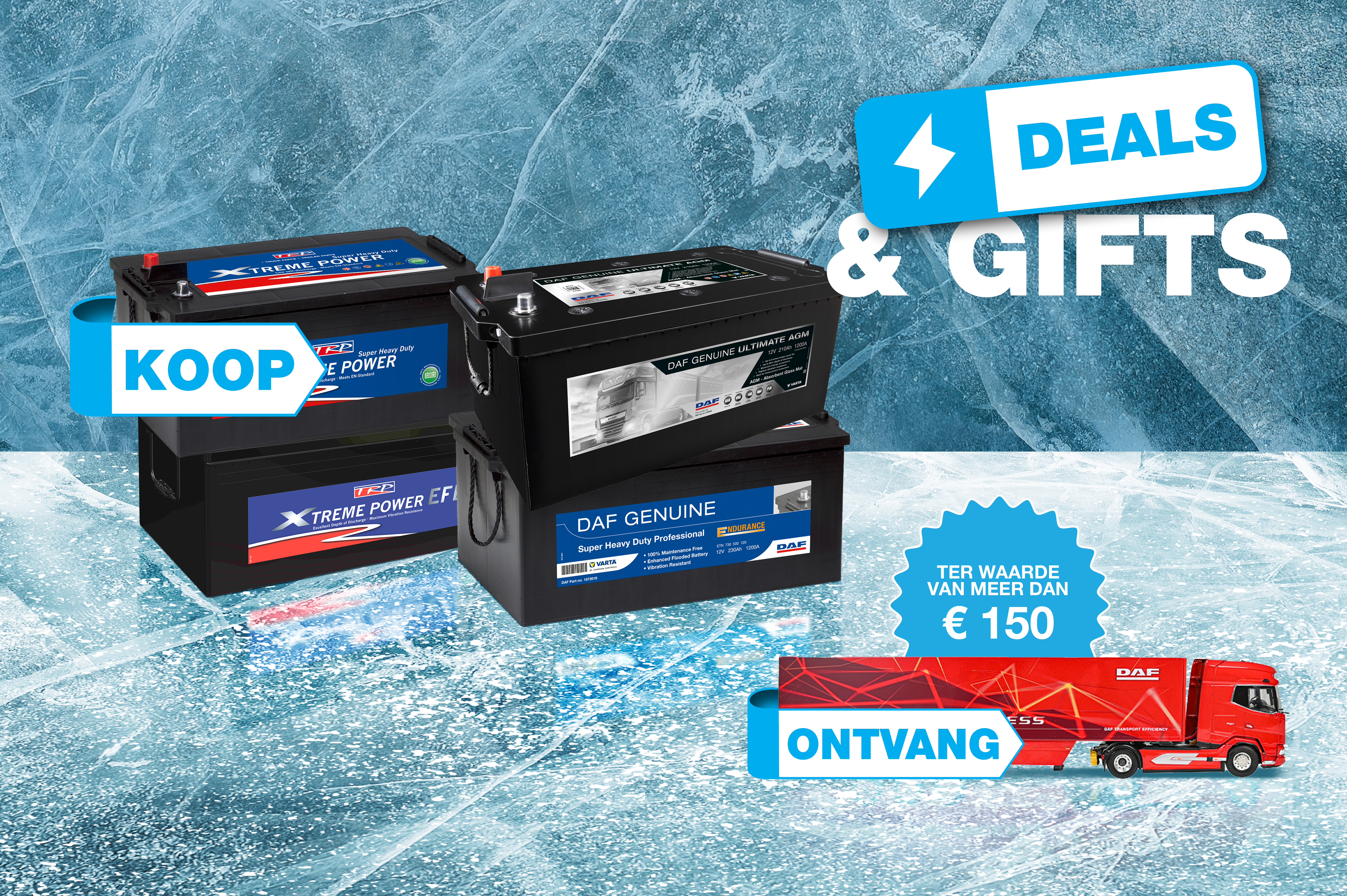 Bestel minimaal 12 batterijen in één aankoop via de DAF Webshop in oktober en november en ontvang een gratis DAF XG+ miniatuurtruck op schaal 1:50 ter waarde van meer dan €150!
