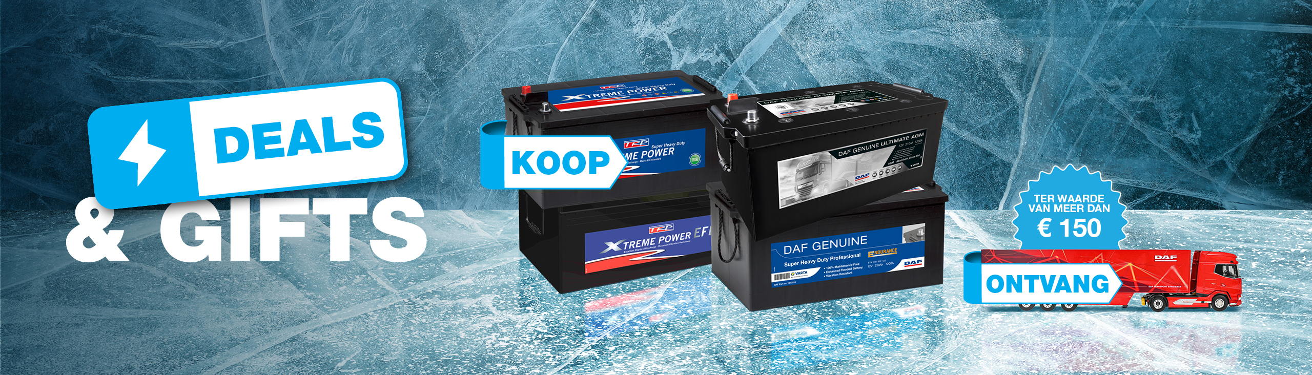 - U ontvangt een gratis cadeau wanneer u 12 accu's in één bestelling koopt via de DAF Webshop tijdens de promotieperiode. U ontvangt een gratis model van een DAF XG+-truck op een schaal van 1:50, ter waarde van ruim € 150. Neem voor meer informatie contact op met uw dealer of DPM.