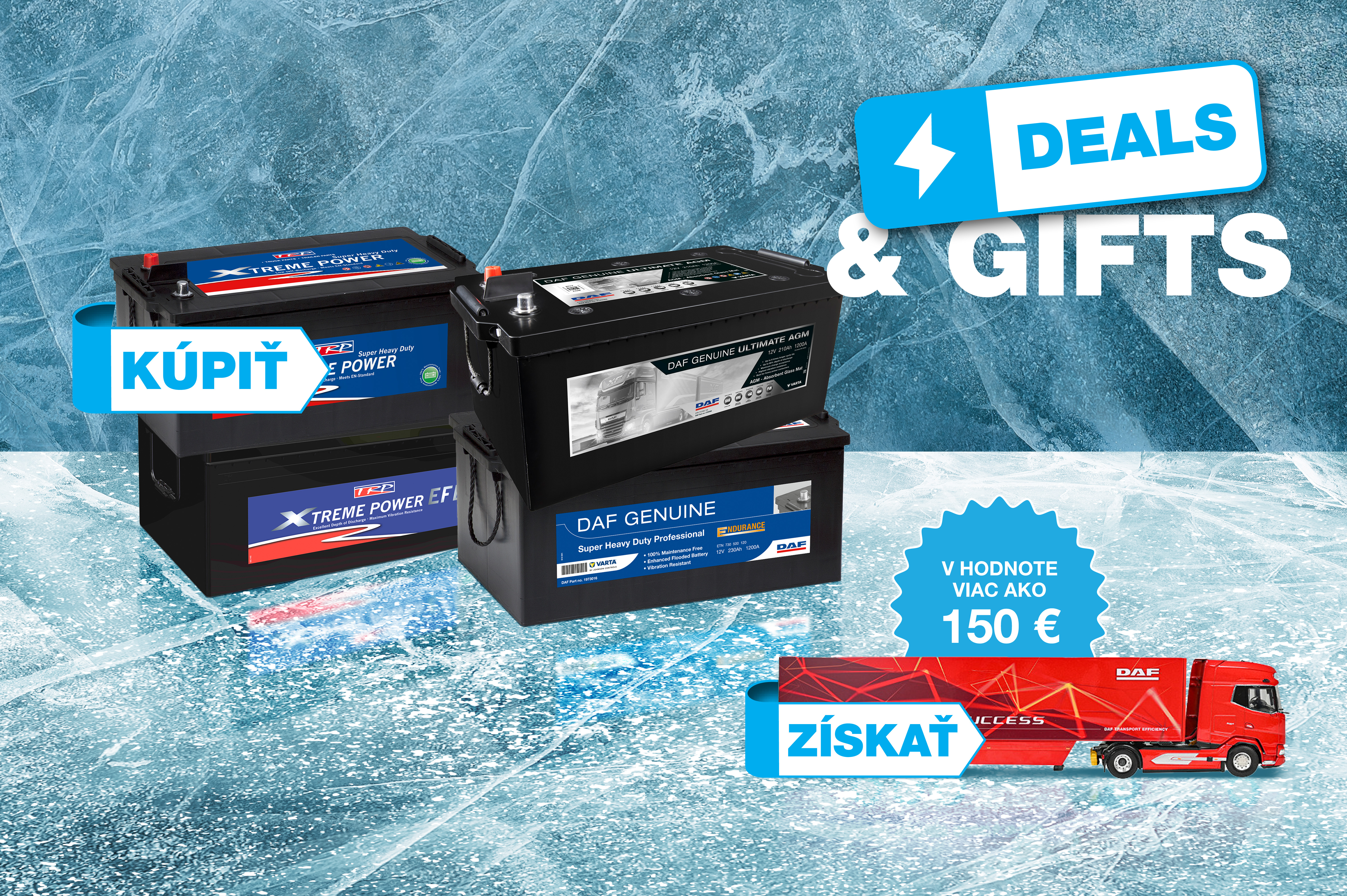 Pri nákupe minimálne 12 vybraných akumulátorov v jednej objednávke získate zadarmo zmenšený model nákladného vozidla DAF XG+ v mierke 1 : 50 v hodnote viac ako 150 €. Môžete sa tak pripraviť na zimu. Keďže sa blížia chladnejšie teploty, spoľahlivý akumulátor udrží vaše nákladné vozidlá na ceste.